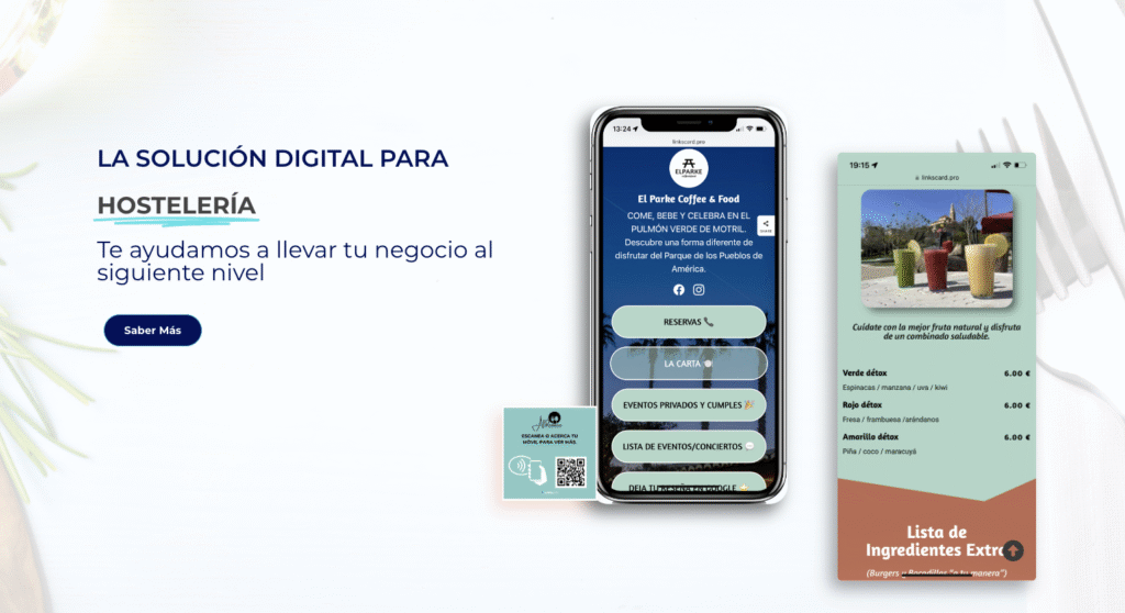 LinksCard para restaurantes es una solución digital moderna que reemplaza las cartas físicas y PDF por menús interactivos accesibles desde cualquier dispositivo móvil. Diseñada especialmente para bares, restaurantes y chiringuitos, permite mostrar la carta de forma clara, atractiva y siempre actualizada, con fotos, precios y descripciones.